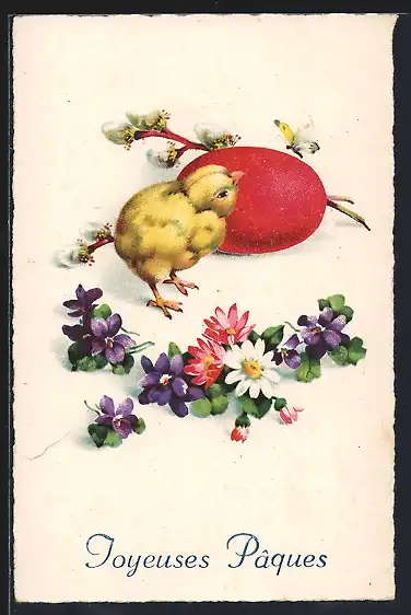 AK Osterküken mit Osterei, Weidenzweig und Veilchen