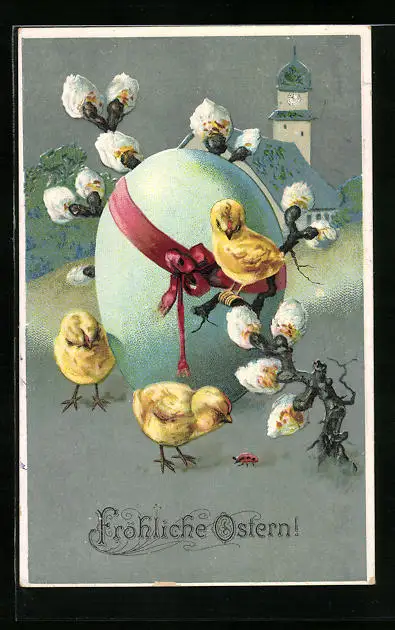 AK Osterküken mit Osterei und Palmkätzchenzweig