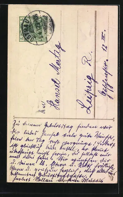 Personenbezogene Daten auf der Rückseite der Karte wurden durch blauen Textmarker unkenntlich gemacht. Die blauen Stellen sind auf die Vorderseite durchgeweicht und wirken sich negativ auf das Postkartenfoto aus