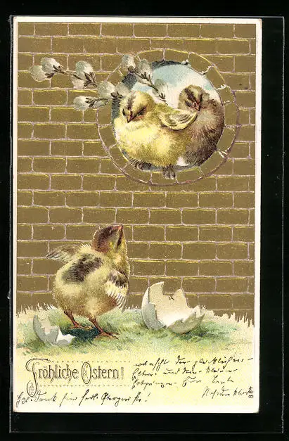 AK Osterküken mit Palmkätzchenzweigen