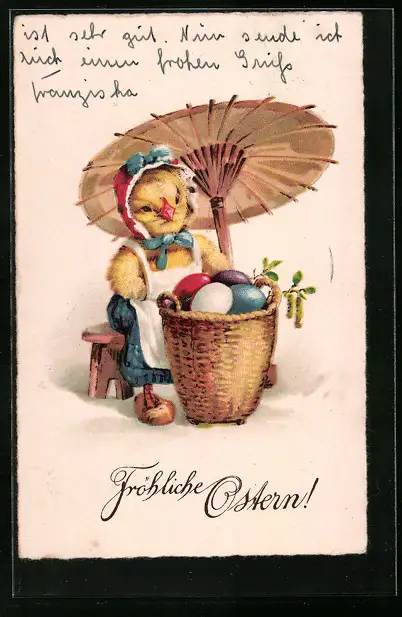 AK Osterküken mit Schirm und Korb voller Ostereiern