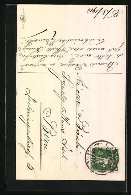 Personenbezogene Daten auf der Rückseite der Karte wurden durch blauen Textmarker unkenntlich gemacht. Die blauen Stellen sind auf die Vorderseite durchgeweicht und wirken sich negativ auf das Postkartenfoto aus