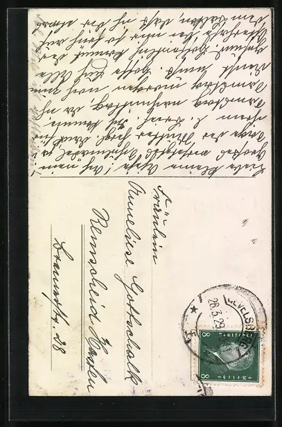 Personenbezogene Daten auf der Rückseite der Karte wurden durch blauen Textmarker unkenntlich gemacht. Die blauen Stellen sind auf die Vorderseite durchgeweicht und wirken sich negativ auf das Postkartenfoto aus
