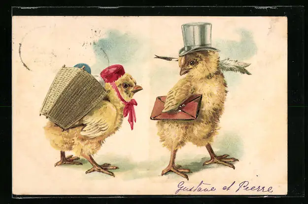 AK Osterküken mit Zylinder und Korb voller Ostereiern