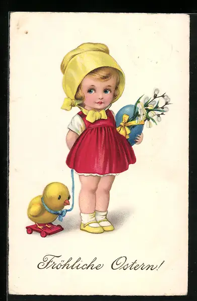 AK Osterküken neben Mädchen mit Osterei