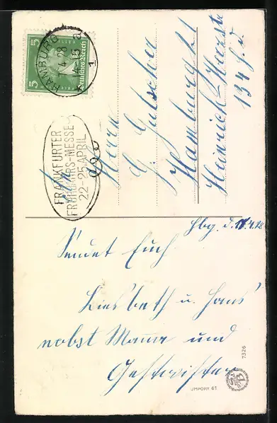 Personenbezogene Daten auf der Rückseite der Karte wurden durch blauen Textmarker unkenntlich gemacht. Die blauen Stellen sind auf die Vorderseite durchgeweicht und wirken sich negativ auf das Postkartenfoto aus