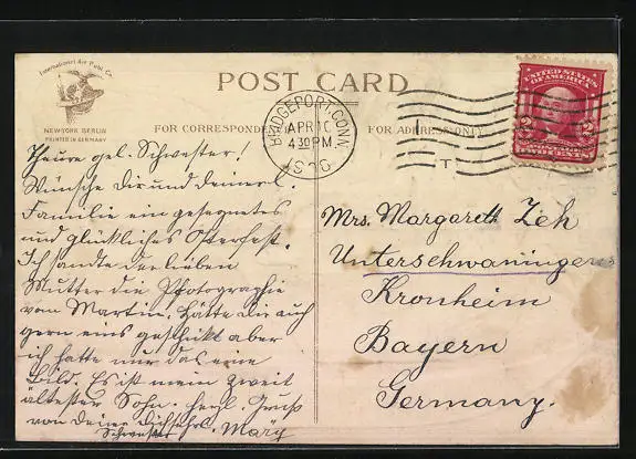 Personenbezogene Daten auf der Rückseite der Karte wurden durch blauen Textmarker unkenntlich gemacht. Die blauen Stellen sind auf die Vorderseite durchgeweicht und wirken sich negativ auf das Postkartenfoto aus