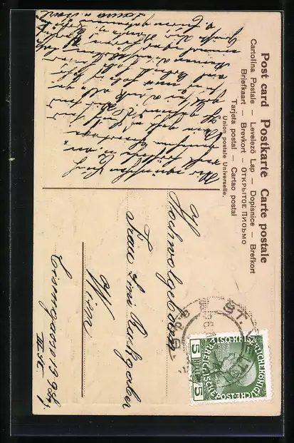 Personenbezogene Daten auf der Rückseite der Karte wurden durch blauen Textmarker unkenntlich gemacht. Die blauen Stellen sind auf die Vorderseite durchgeweicht und wirken sich negativ auf das Postkartenfoto aus