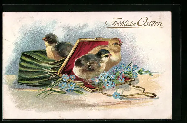 AK Osterküken sitzen in der Tasche mit Vergissmeinnicht
