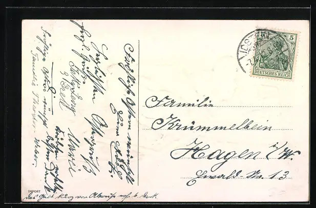 Personenbezogene Daten auf der Rückseite der Karte wurden durch blauen Textmarker unkenntlich gemacht. Die blauen Stellen sind auf die Vorderseite durchgeweicht und wirken sich negativ auf das Postkartenfoto aus