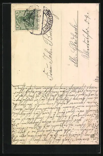Personenbezogene Daten auf der Rückseite der Karte wurden durch blauen Textmarker unkenntlich gemacht. Die blauen Stellen sind auf die Vorderseite durchgeweicht und wirken sich negativ auf das Postkartenfoto aus