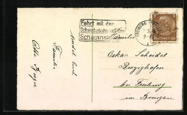 Personenbezogene Daten auf der Rückseite der Karte wurden durch blauen Textmarker unkenntlich gemacht. Die blauen Stellen sind auf die Vorderseite durchgeweicht und wirken sich negativ auf das Postkartenfoto aus