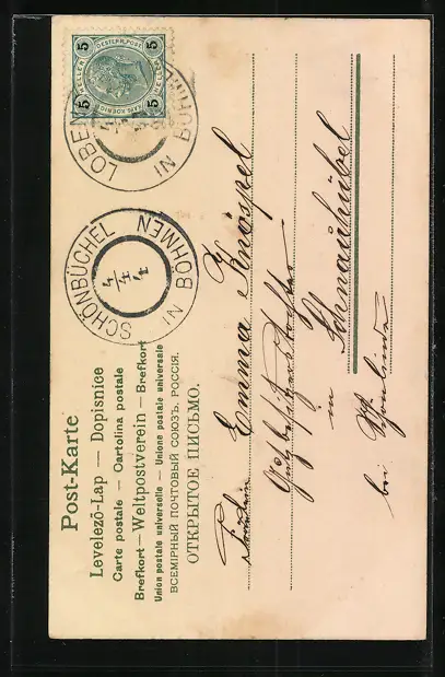 Personenbezogene Daten auf der Rückseite der Karte wurden durch blauen Textmarker unkenntlich gemacht. Die blauen Stellen sind auf die Vorderseite durchgeweicht und wirken sich negativ auf das Postkartenfoto aus