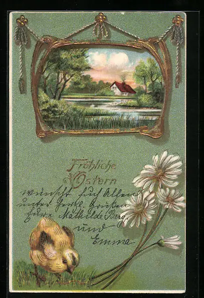 AK Osterküken und idyllische Landschaft
