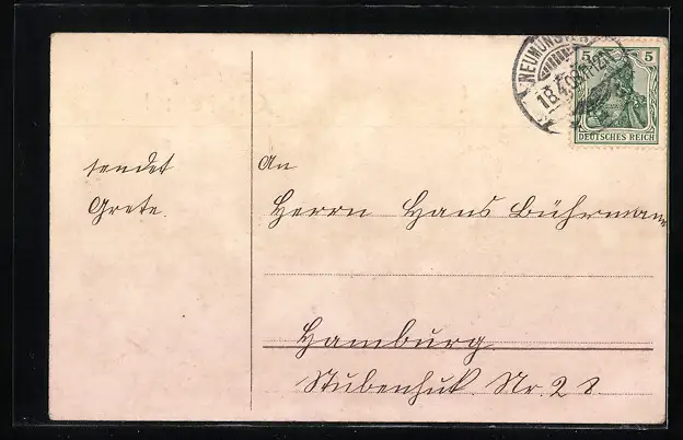 Personenbezogene Daten auf der Rückseite der Karte wurden durch blauen Textmarker unkenntlich gemacht. Die blauen Stellen sind auf die Vorderseite durchgeweicht und wirken sich negativ auf das Postkartenfoto aus