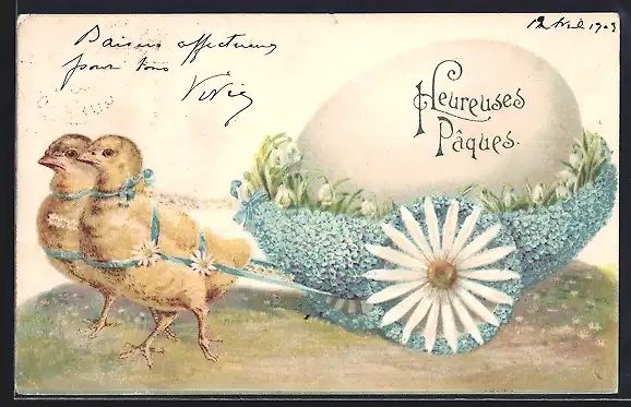 AK Osterküken ziehen einen Wagen, Heureuses Pâques