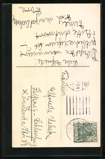 Personenbezogene Daten auf der Rückseite der Karte wurden durch blauen Textmarker unkenntlich gemacht. Die blauen Stellen sind auf die Vorderseite durchgeweicht und wirken sich negativ auf das Postkartenfoto aus
