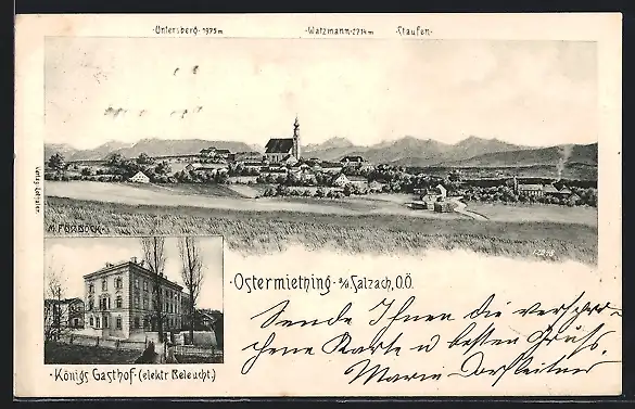 AK Ostermiething, Königs Gasthof, Ortsansicht gegen Watzmann