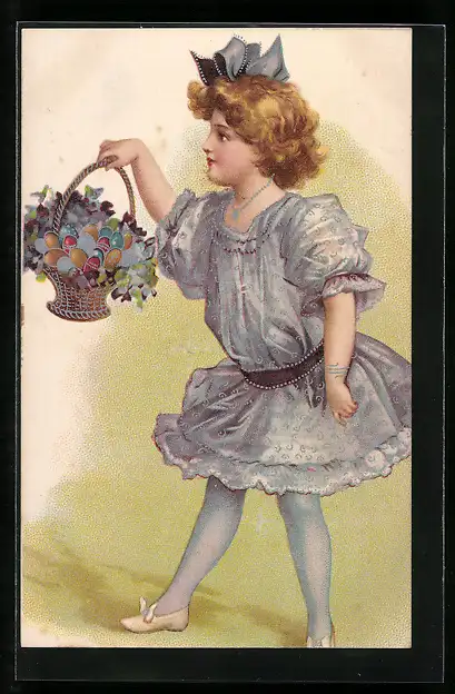AK Ostern, Mädchen trägt Korb mit bunten Ostereiern