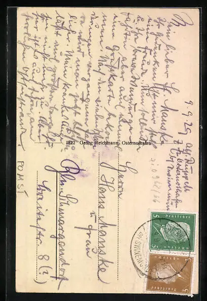 Personenbezogene Daten auf der Rückseite der Karte wurden durch blauen Textmarker unkenntlich gemacht. Die blauen Stellen sind auf die Vorderseite durchgeweicht und wirken sich negativ auf das Postkartenfoto aus