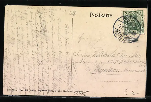 Personenbezogene Daten auf der Rückseite der Karte wurden durch blauen Textmarker unkenntlich gemacht. Die blauen Stellen sind auf die Vorderseite durchgeweicht und wirken sich negativ auf das Postkartenfoto aus