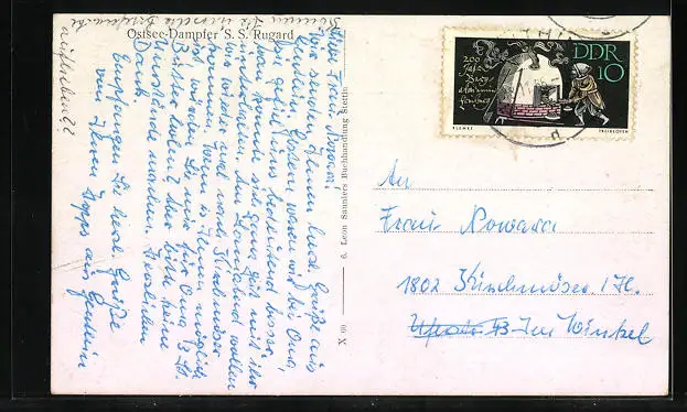 Personenbezogene Daten auf der Rückseite der Karte wurden durch blauen Textmarker unkenntlich gemacht. Die blauen Stellen sind auf die Vorderseite durchgeweicht und wirken sich negativ auf das Postkartenfoto aus