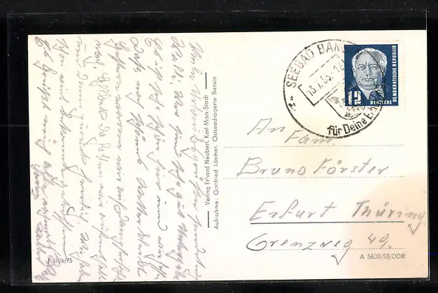 Personenbezogene Daten auf der Rückseite der Karte wurden durch blauen Textmarker unkenntlich gemacht. Die blauen Stellen sind auf die Vorderseite durchgeweicht und wirken sich negativ auf das Postkartenfoto aus