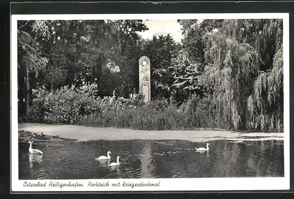 AK Ostseebad Heiligenhafen, Parkteich mit Kriegerdenkmal