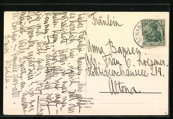 Personenbezogene Daten auf der Rückseite der Karte wurden durch blauen Textmarker unkenntlich gemacht. Die blauen Stellen sind auf die Vorderseite durchgeweicht und wirken sich negativ auf das Postkartenfoto aus