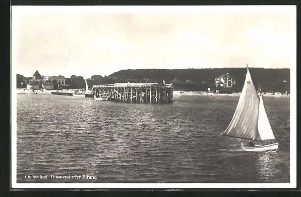AK Ostseebad Timmendorferstrand, Blick von der Ostsee zum Strand mit Segelboot