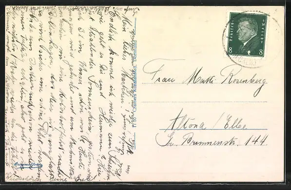 Personenbezogene Daten auf der Rückseite der Karte wurden durch blauen Textmarker unkenntlich gemacht. Die blauen Stellen sind auf die Vorderseite durchgeweicht und wirken sich negativ auf das Postkartenfoto aus