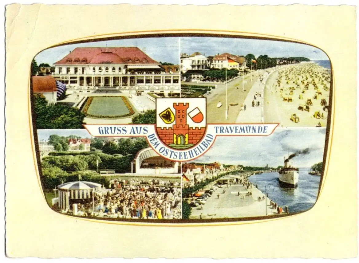 Ansichtskarte Ostseeheilbad Travemünde vier Abb., gestaltet Erhaltung II, Eckbug oben links postalisch gelaufen, gestempelt: (24a) Lübeck 1, 26.7.60 Verlag: Schöning & Co, Lübeck