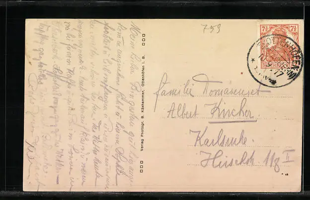 Personenbezogene Daten auf der Rückseite der Karte wurden durch blauen Textmarker unkenntlich gemacht. Die blauen Stellen sind auf die Vorderseite durchgeweicht und wirken sich negativ auf das Postkartenfoto aus