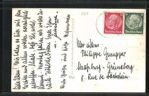 Personenbezogene Daten auf der Rückseite der Karte wurden durch blauen Textmarker unkenntlich gemacht. Die blauen Stellen sind auf die Vorderseite durchgeweicht und wirken sich negativ auf das Postkartenfoto aus