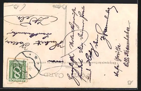 Personenbezogene Daten auf der Rückseite der Karte wurden durch blauen Textmarker unkenntlich gemacht. Die blauen Stellen sind auf die Vorderseite durchgeweicht und wirken sich negativ auf das Postkartenfoto aus