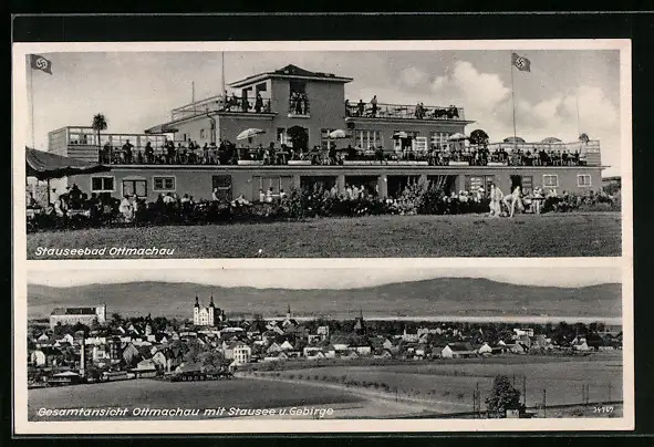 AK Ottmachau, Ortsansicht, Stauseebad, -Fahne