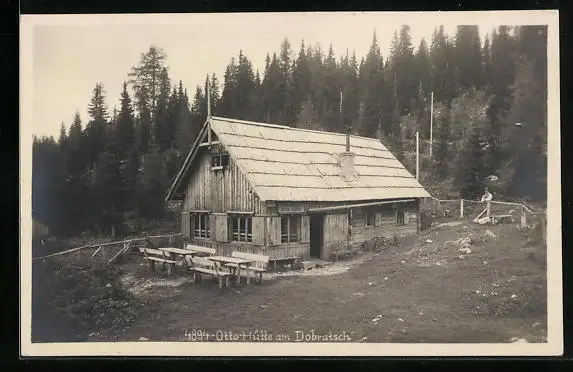 AK Otto-Hütte am Dobratsch, Partie vor der Berghütte am Waldrand