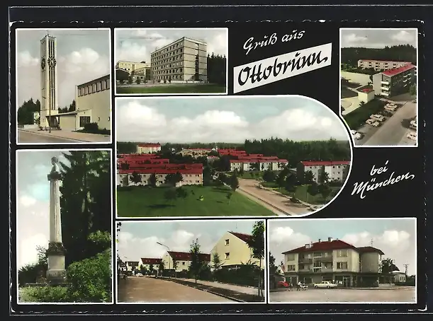 AK Ottobrunn bei München, Strassenpartie mit Kirche, Hochhäuser, Denkmal