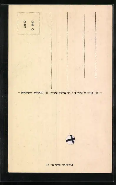 Personenbezogene Daten auf der Rückseite der Karte wurden durch blauen Textmarker unkenntlich gemacht. Die blauen Stellen sind auf die Vorderseite durchgeweicht und wirken sich negativ auf das Postkartenfoto aus