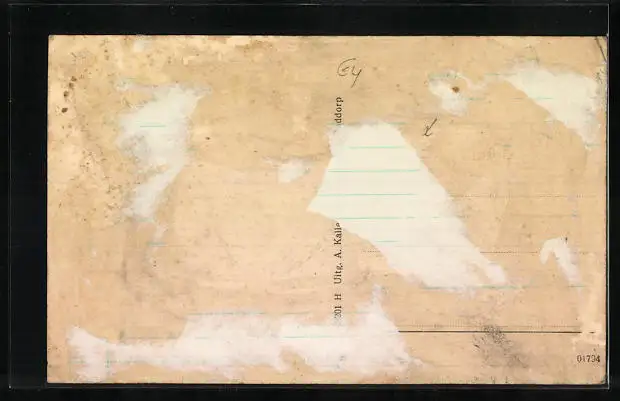 Personenbezogene Daten auf der Rückseite der Karte wurden durch blauen Textmarker unkenntlich gemacht. Die blauen Stellen sind auf die Vorderseite durchgeweicht und wirken sich negativ auf das Postkartenfoto aus