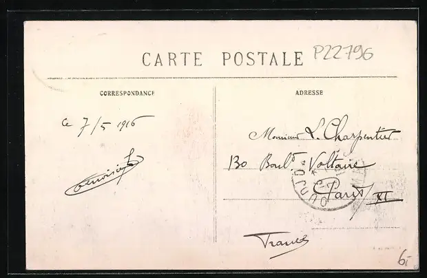 Personenbezogene Daten auf der Rückseite der Karte wurden durch blauen Textmarker unkenntlich gemacht. Die blauen Stellen sind auf die Vorderseite durchgeweicht und wirken sich negativ auf das Postkartenfoto aus