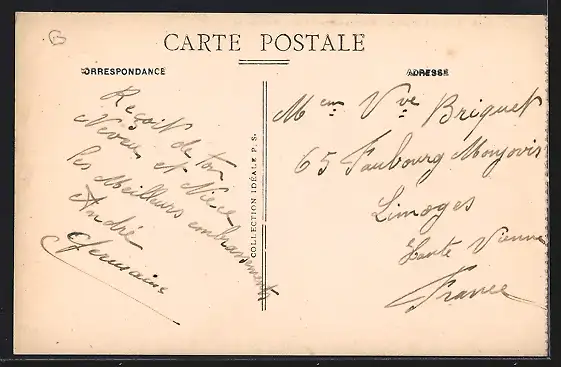 Personenbezogene Daten auf der Rückseite der Karte wurden durch blauen Textmarker unkenntlich gemacht. Die blauen Stellen sind auf die Vorderseite durchgeweicht und wirken sich negativ auf das Postkartenfoto aus