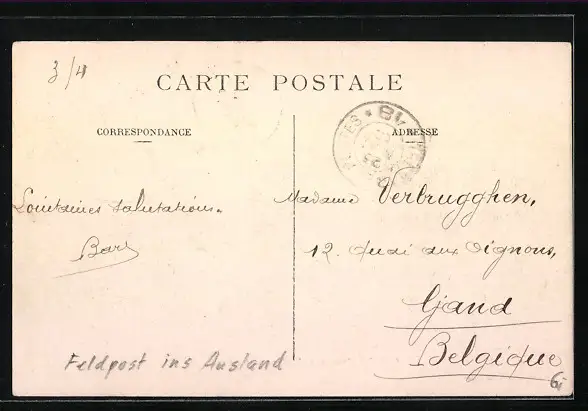 Personenbezogene Daten auf der Rückseite der Karte wurden durch blauen Textmarker unkenntlich gemacht. Die blauen Stellen sind auf die Vorderseite durchgeweicht und wirken sich negativ auf das Postkartenfoto aus