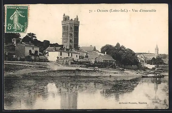 AK Oudon, Vue d`ensemble avec tour médiévale et rivière