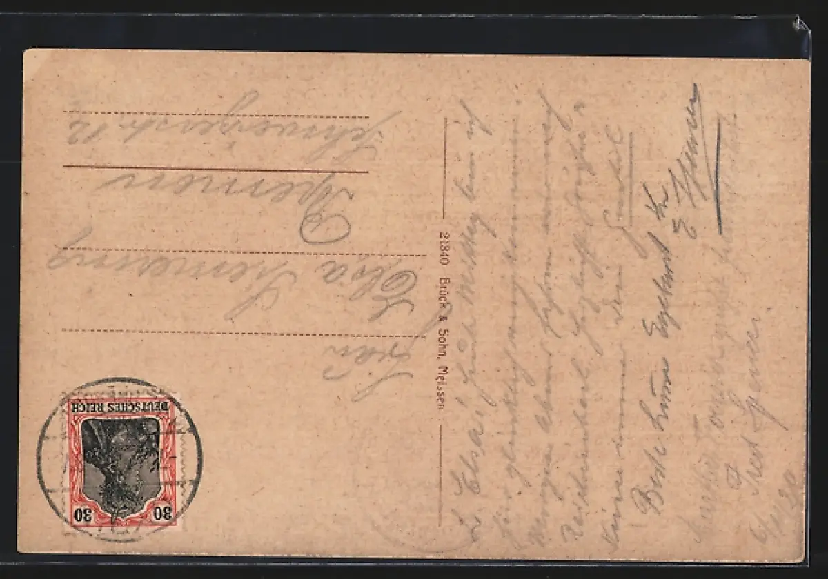Personenbezogene Daten auf der Rückseite der Karte wurden durch blauen Textmarker unkenntlich gemacht. Die blauen Stellen sind auf die Vorderseite durchgeweicht und wirken sich negativ auf das Postkartenfoto aus