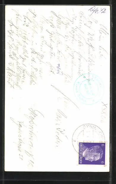 Personenbezogene Daten auf der Rückseite der Karte wurden durch blauen Textmarker unkenntlich gemacht. Die blauen Stellen sind auf die Vorderseite durchgeweicht und wirken sich negativ auf das Postkartenfoto aus