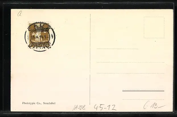 Personenbezogene Daten auf der Rückseite der Karte wurden durch blauen Textmarker unkenntlich gemacht. Die blauen Stellen sind auf die Vorderseite durchgeweicht und wirken sich negativ auf das Postkartenfoto aus