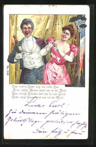 AK Paar feiert mit Sekt, Mann trägt einen Monokel