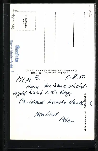 Personenbezogene Daten auf der Rückseite der Karte wurden durch blauen Textmarker unkenntlich gemacht. Die blauen Stellen sind auf die Vorderseite durchgeweicht und wirken sich negativ auf das Postkartenfoto aus