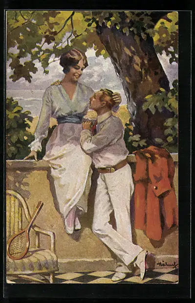 AK Paar in Tenniskleidung beim Stelldichein